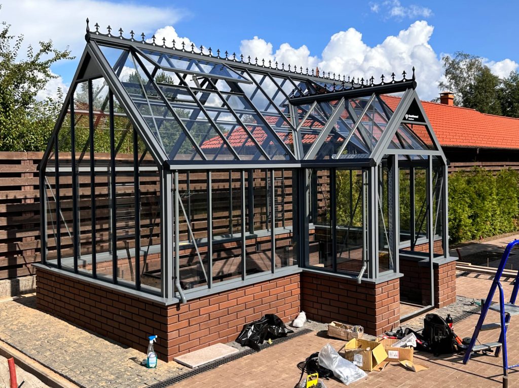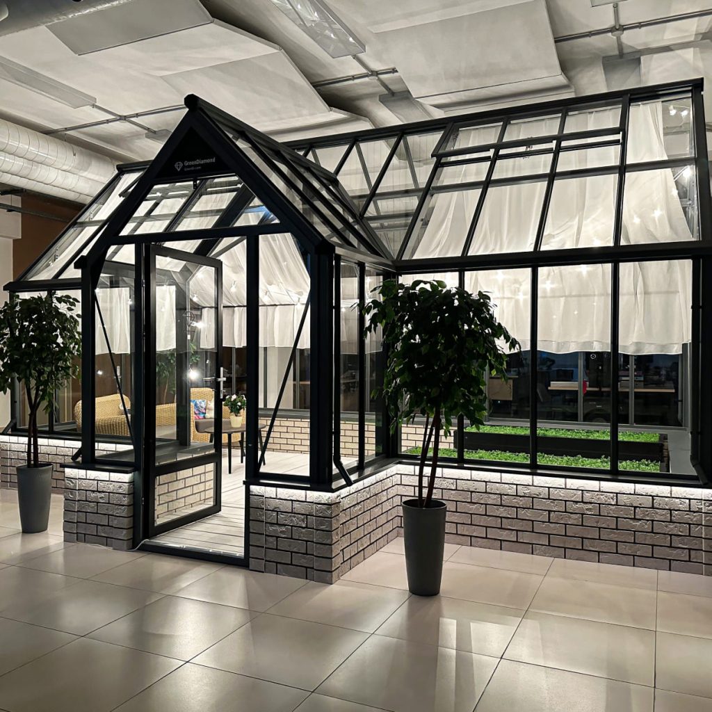Теплица выполнена из фигурных алюминиевых профилей разного сечения. Включает в себя интегрированную водосточную систему. Угол ската крыши 45°