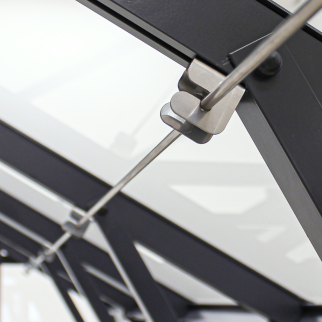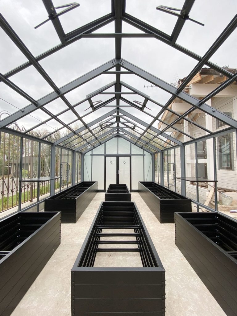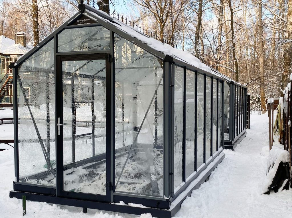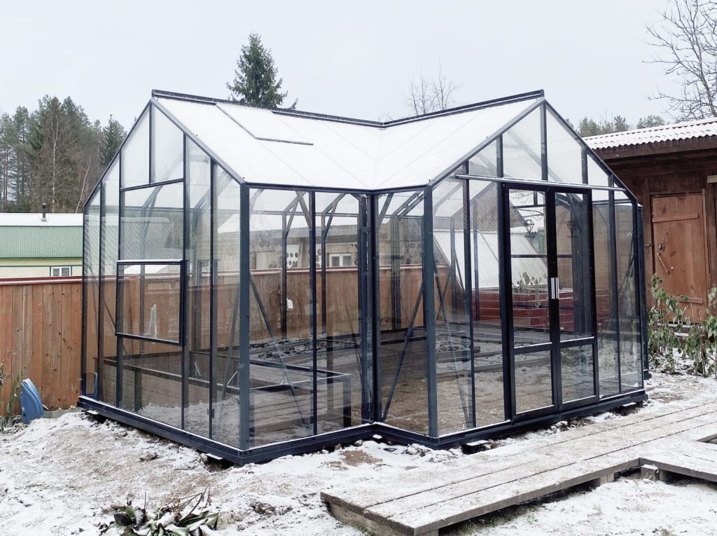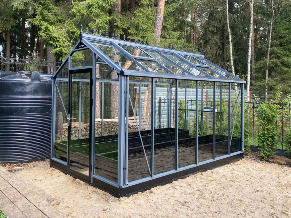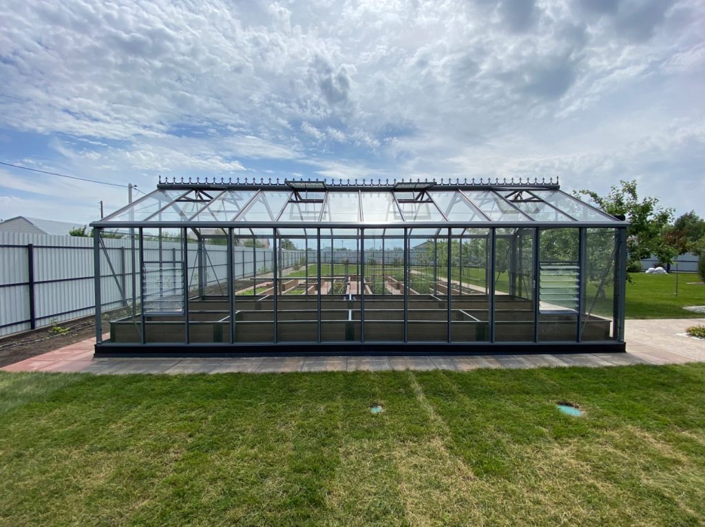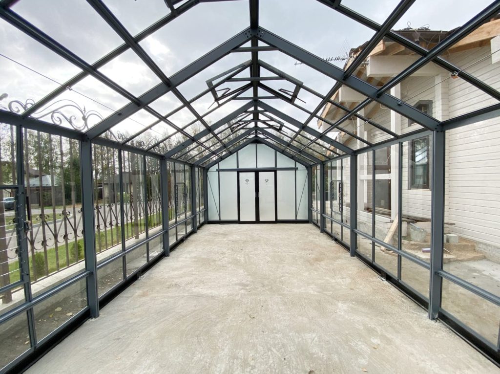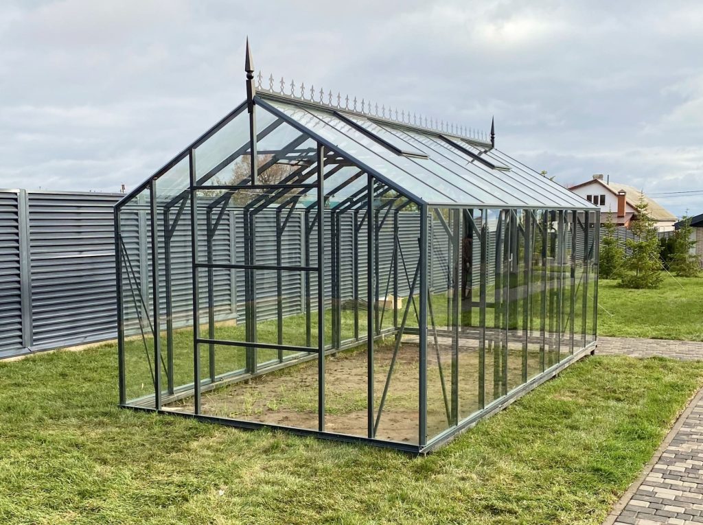 Теплица выполнена из фигурных алюминиевых профилей разного сечения. Включает в себя интегрированную водосточную систему. Угол ската крыши 30°